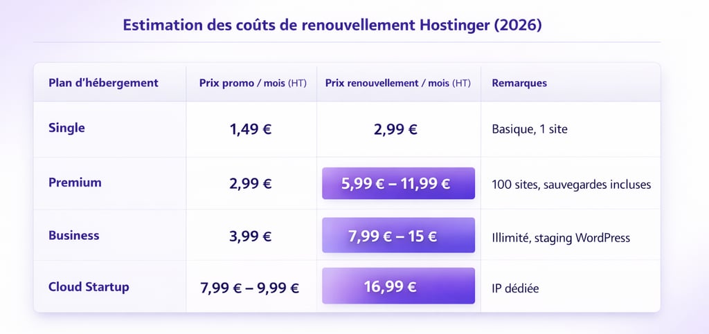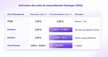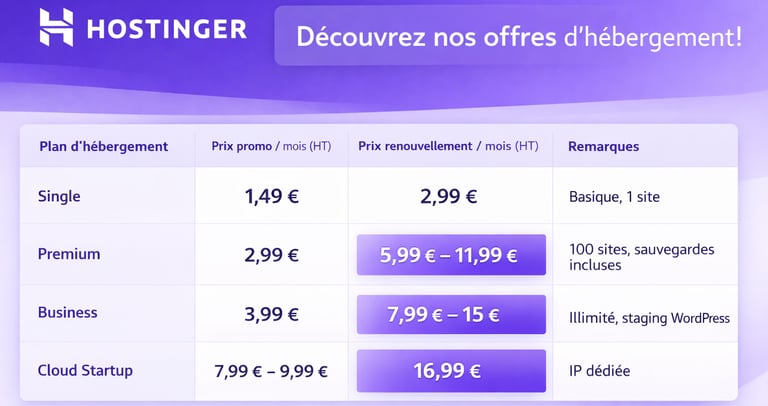 Les tarifs affichés par Hostinger sont valables uniquement lors de la première souscription, souvent avec un engagement long (12, 24 ou 48 mois). Une fois cette période terminée, les prix augmentent fortement.