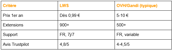 L’un des arguments les plus forts de LWS reste son prix. Il est possible d’acheter un nom de domaine LWS dès 0,99 € la première année, ce qui en fait l’un des registrars les plus compétitifs du marché français.